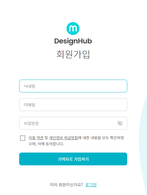 디자인 허브 기여자 되기 버튼을 클릭하시고 간단하게 회원가입을 진행해주세요, 이메일 닉네임, 비밀번호만 입력해주시면 되며, 이메일은 인증을 위해서 실제로 사용하시는 이메일 주소를 입력해주시기 바랍니다.