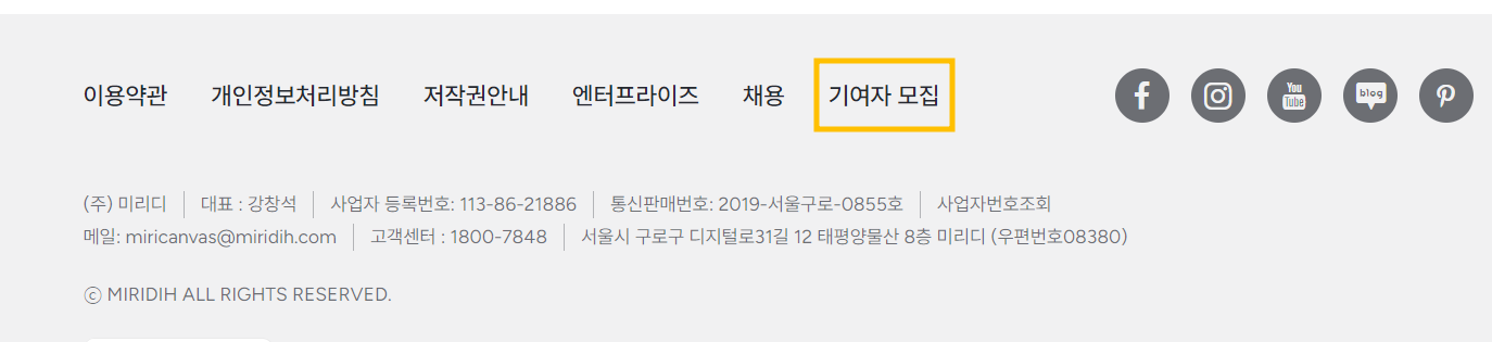 위 사진을 클릭하여 미리캔버스 홈페이지로 접속하여 화면을 제일 아래로 내려가 기여자 모집 버튼을 클릭하여 주세요