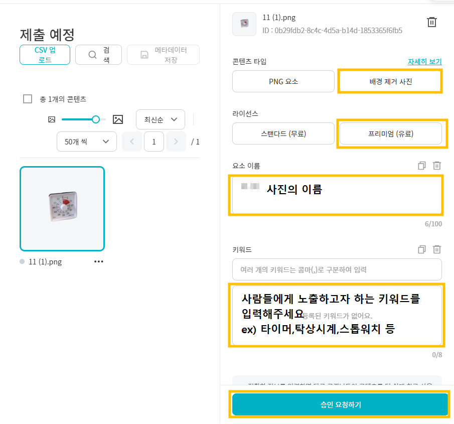 업로드를 마친뒤 [내 콘텐츠 관리 - 요소]에서 내가 올린 사진을 확인하실 수 있습니다. 사진의 우측 상단을 보시면 심사중이라고 나올텐데요. 승인이 나는데까진 영업일 기준 3~7일정도 걸린다고 하니 천천히 기다리면서 사진을 추가로 업로드해주시면 됩니다.