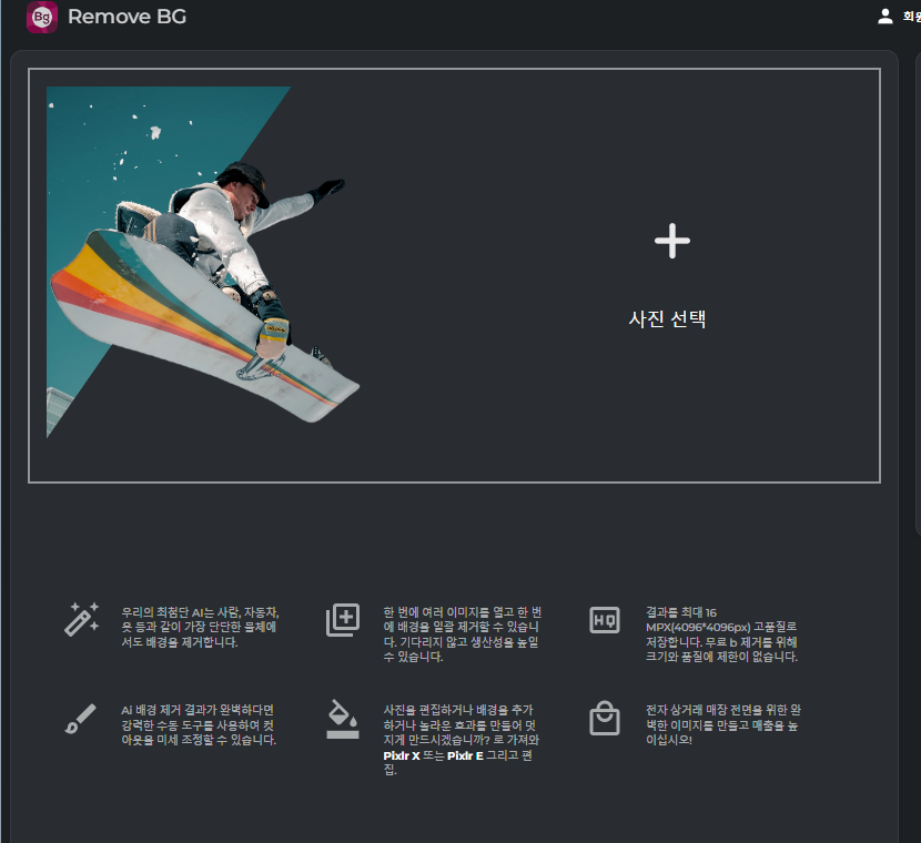 사이트에 접속 후 사이트 하단에 배경 제거 메뉴를 클릭하고 사진만 업로드해주시면 바로 누끼를 따는 작업을 해주는 사이트입니다.