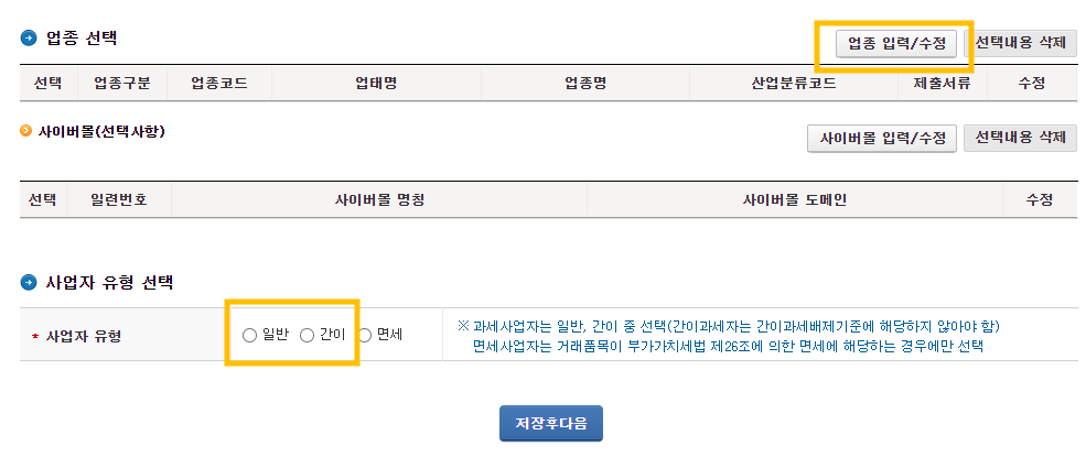 본인의 사업형태에 따라서 선택해주시면 됩니다.