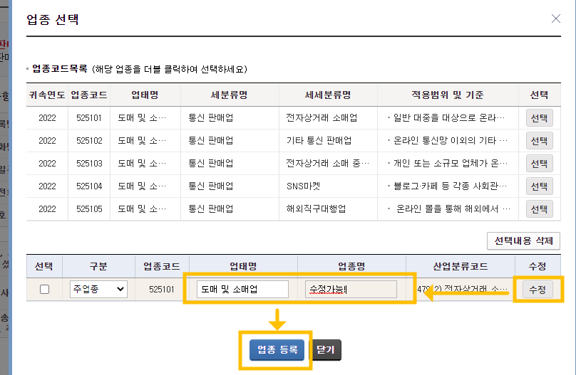 먼저 업종 입력/수정 버튼을 클릭하여 업종을 선택해줍시다