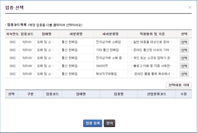 업종코드를 선택하고 나면 아래로 넘어오는데