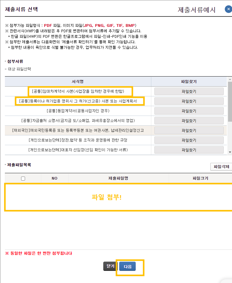 엄종선택이 마무리 되었다면 첨부서류를 첨부할 차례입니다.