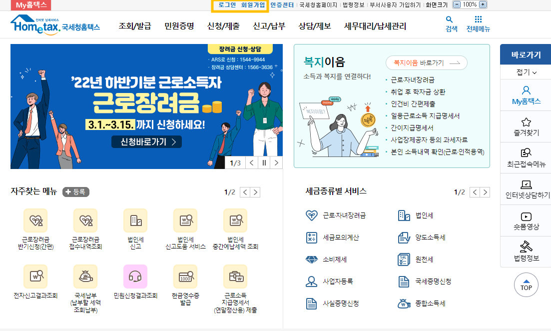 먼저 국세청 홈텍스(www.hometax.go.kr) 사이트에 접속하여