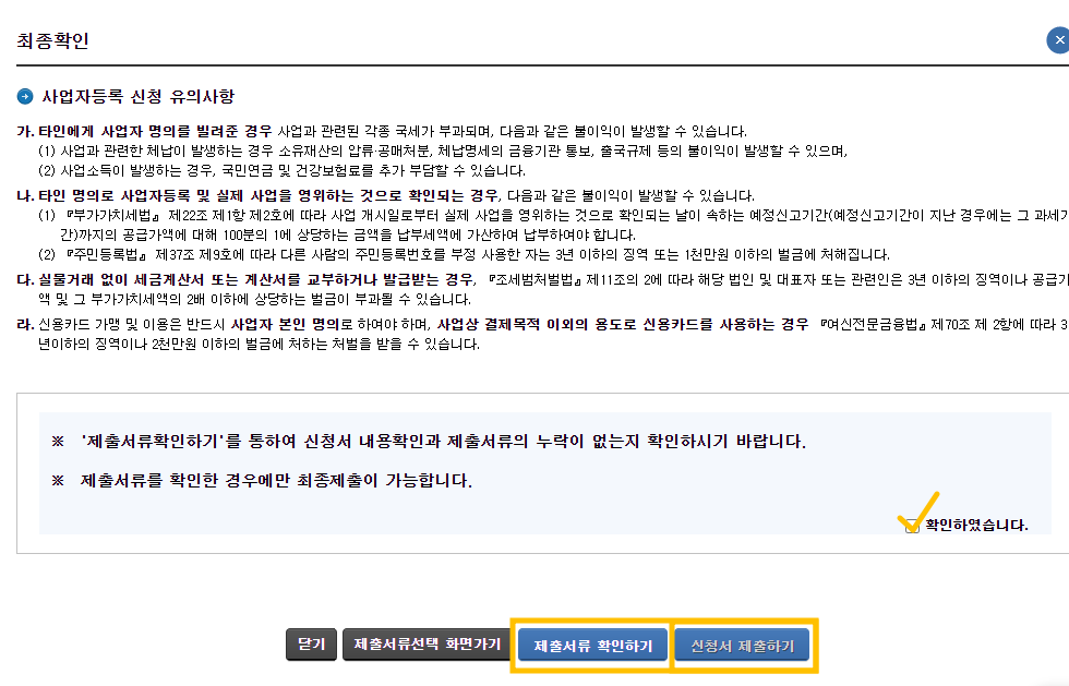 신청서 제출하기 버튼을 클릭하면 사업자등록 신청업무가 끝났습니다!