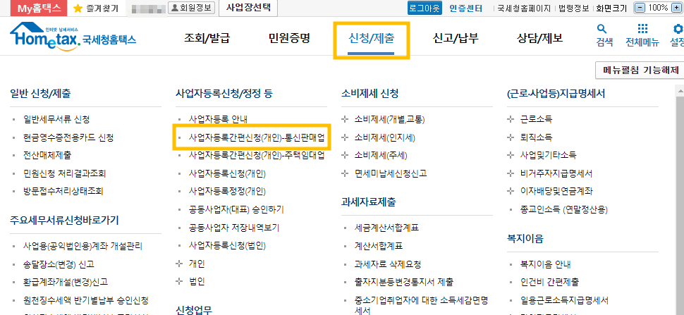 바로 아래 보이는 [사업자등록간편신청(개인)-통신판매업 을 눌러주세요