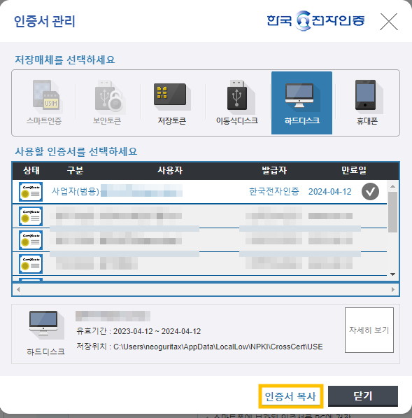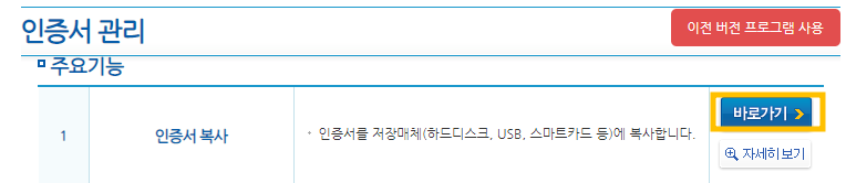 프로그램 설치가 완료되었다면, 인증서 복사 바로가기 버튼을 눌러주세요