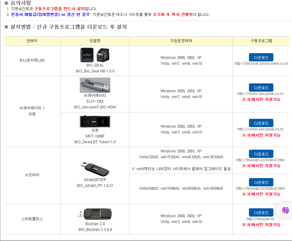 위 사이트에 접속하면 지문보안토큰기 구동 프로그램을 다운 받을 수 있는 팝업화면과 인증서 복사화면이 나오게 됩니다.  먼저 수령해온 토큰기에 맞는 구동 프로그램을 설치해주세요.
