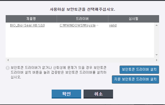 위 사이트에 접속하면 지문보안토큰기 구동 프로그램을 다운 받을 수 있는 팝업화면과 인증서 복사화면이 나오게 됩니다. 먼저 수령해온 토큰기에 맞는 구동 프로그램을 설치해주세요.