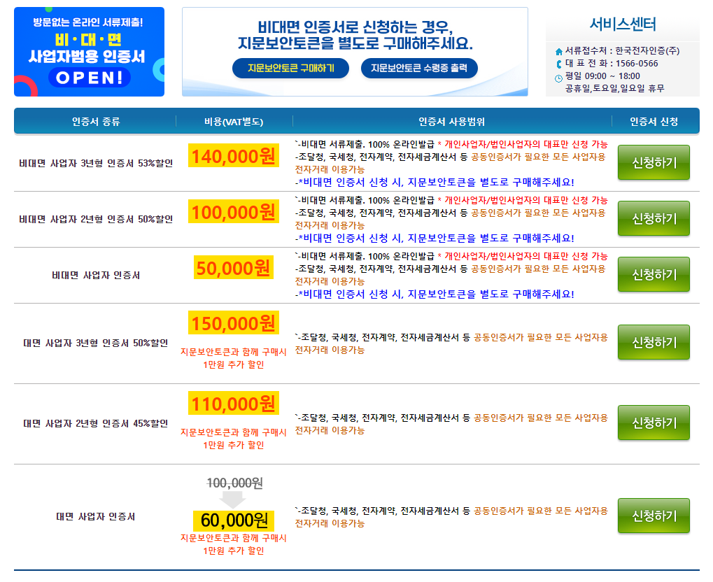발급비용은 아래의 사진에 첨부하였습니다. 범용인증서는 비대면으로 신청할시 1년에 50,000 원, 지문보안토큰기는 64,900 원 총 114,900 원의 비용이 발생하게 됩니다.