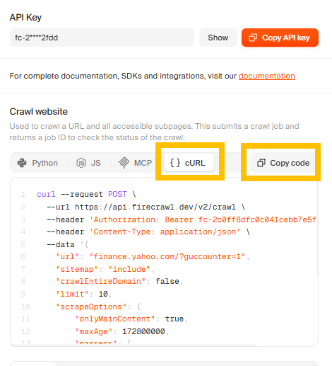 야후 파이낸스 홈페이지의 링크를 복사하여 파이어크롤 사이트에 스크랩을 진행해줍니다