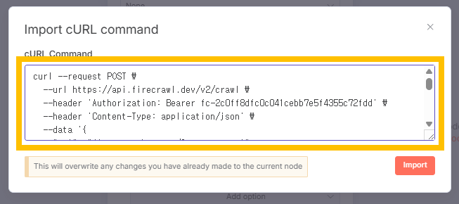 오른쪽 상단에 Import cURL 버튼을 클릭한 뒤